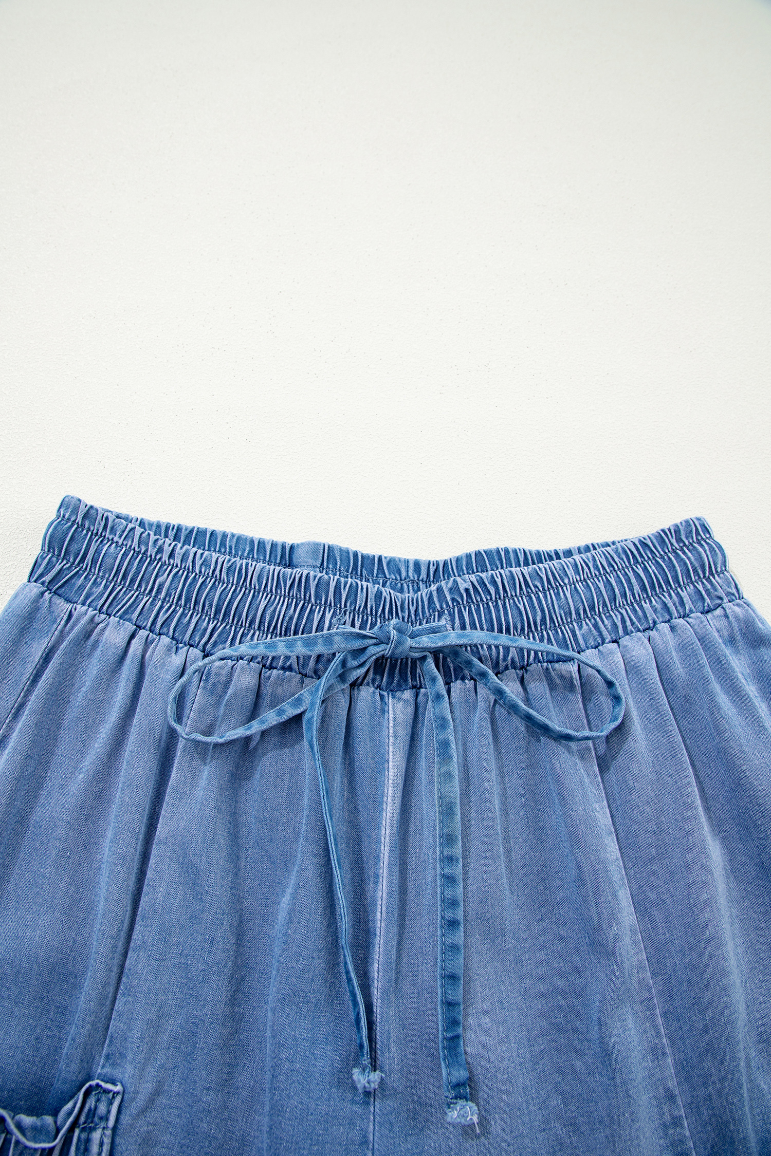 - Loose denim pants feature drawstring elastic waist for adjustable comfort.