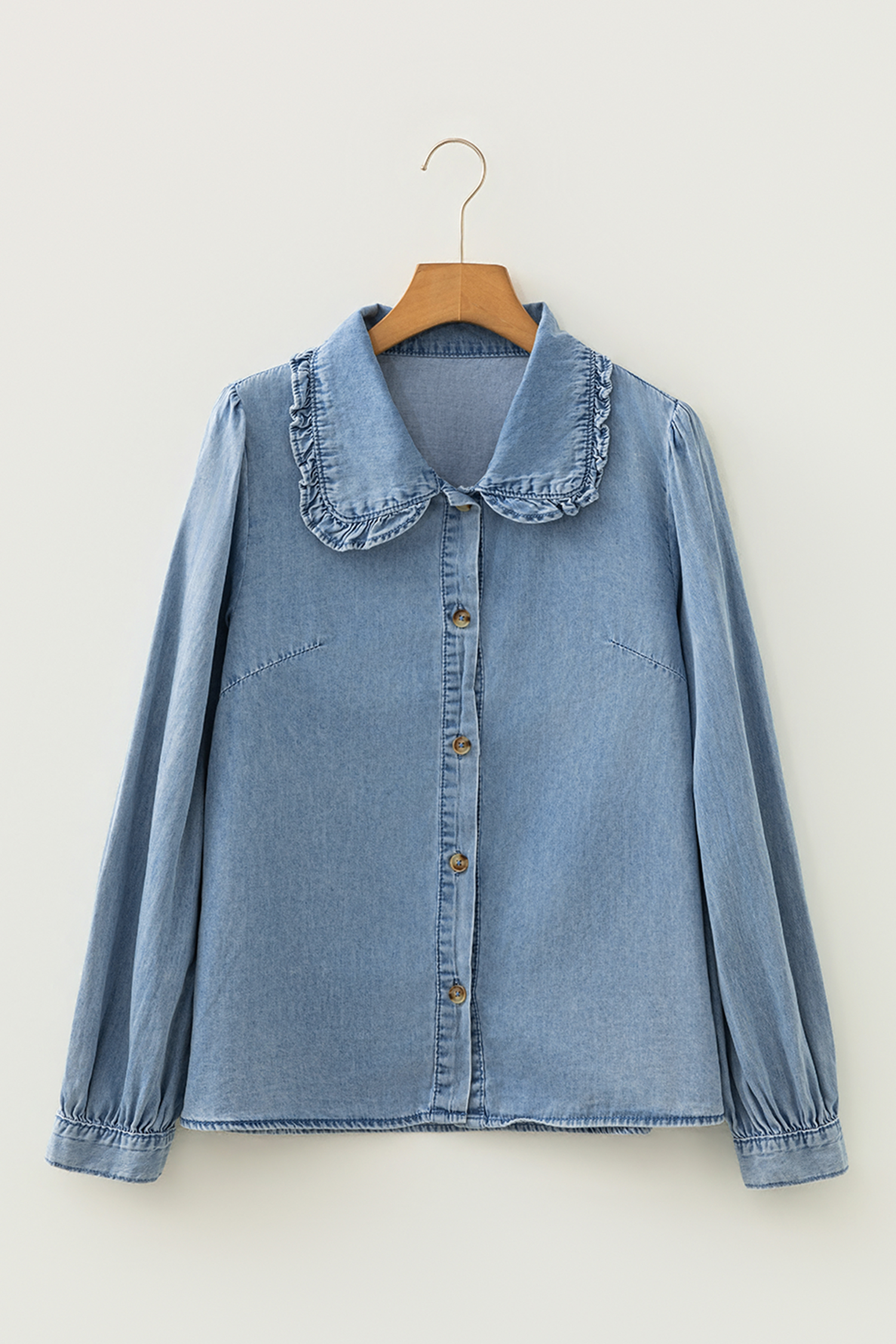 Washed blue shirt also features puff sleeves and buttons front.