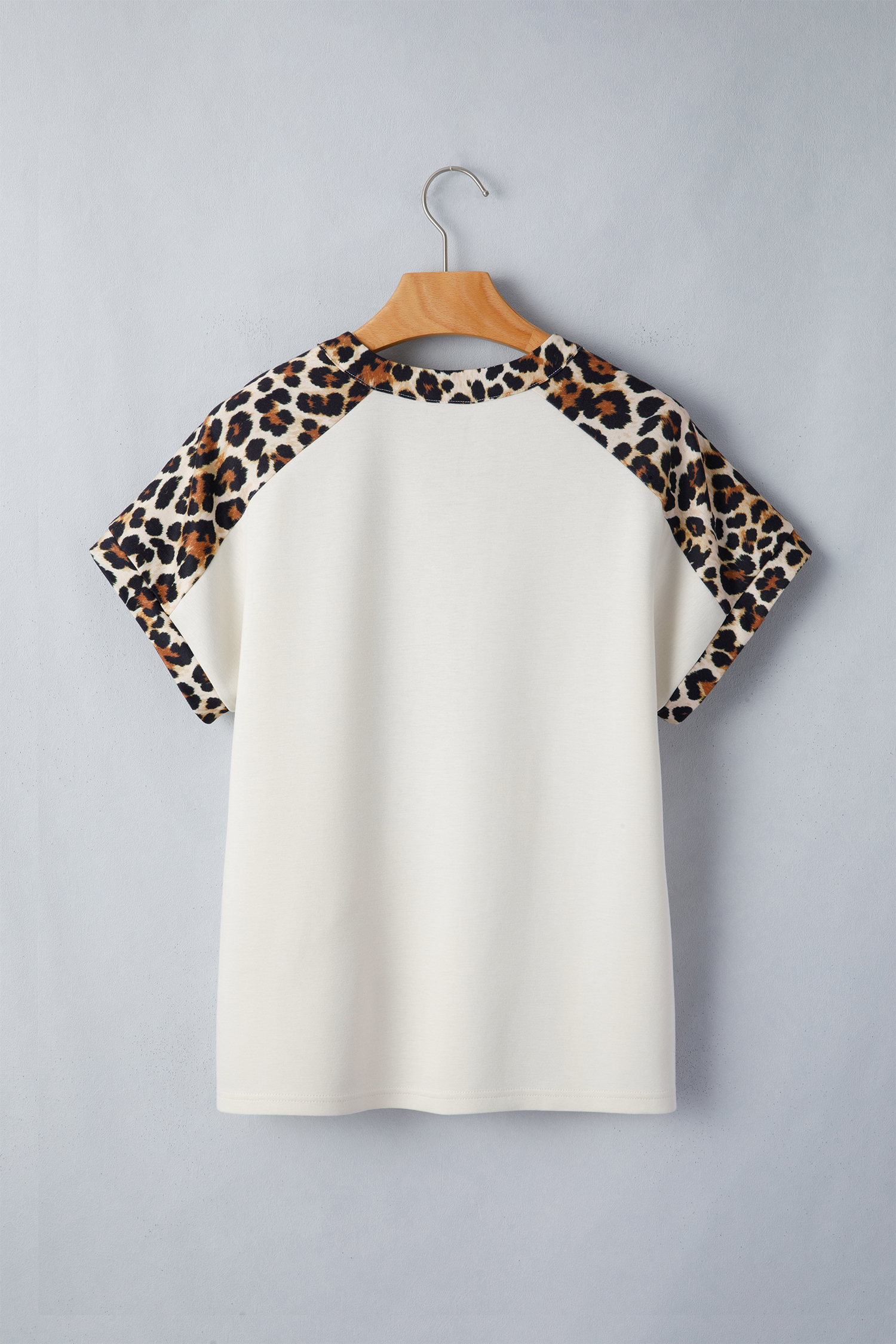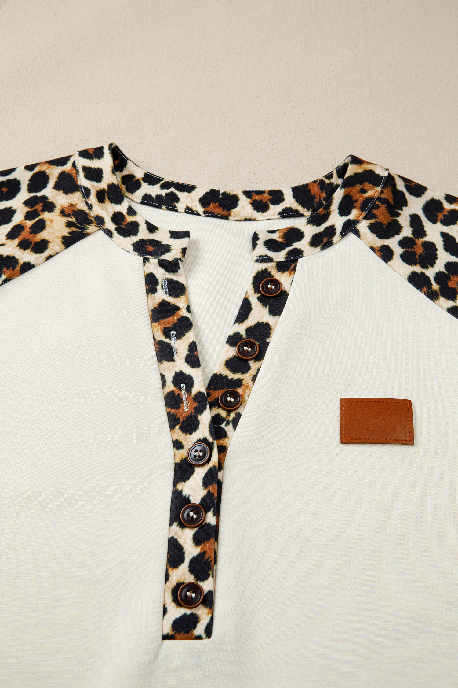 Be the first to review “Beige Leopard Patchwork Half Button Short Sleeve Top”