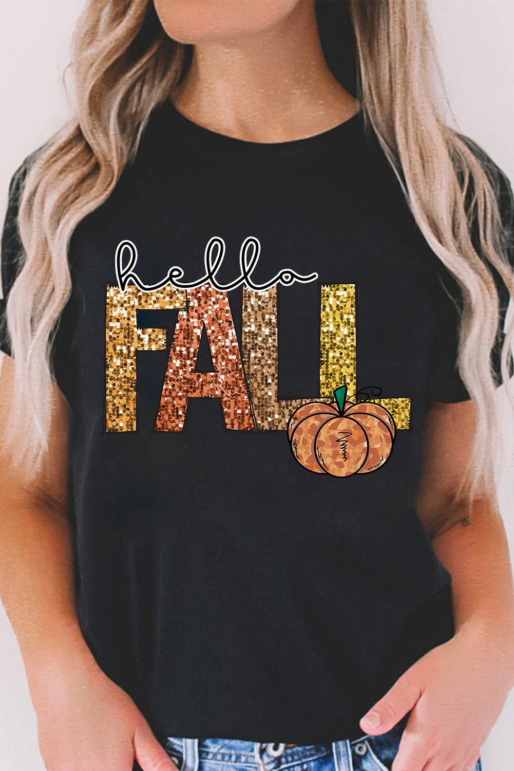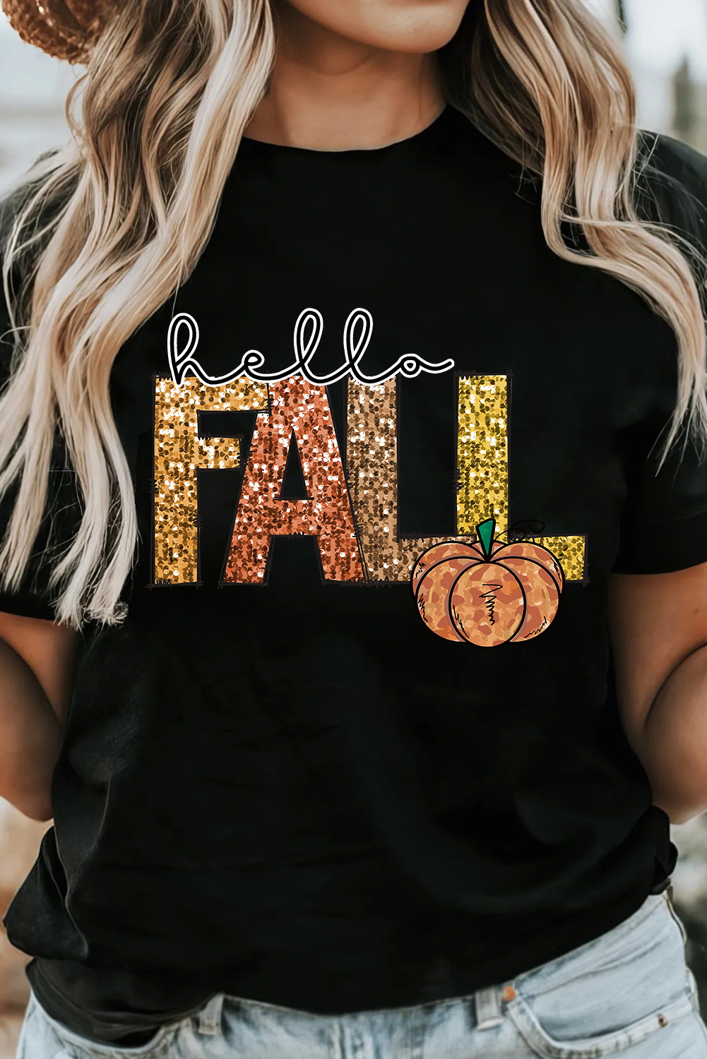 It says hello fall in a heat transfer printed shiny pattern.