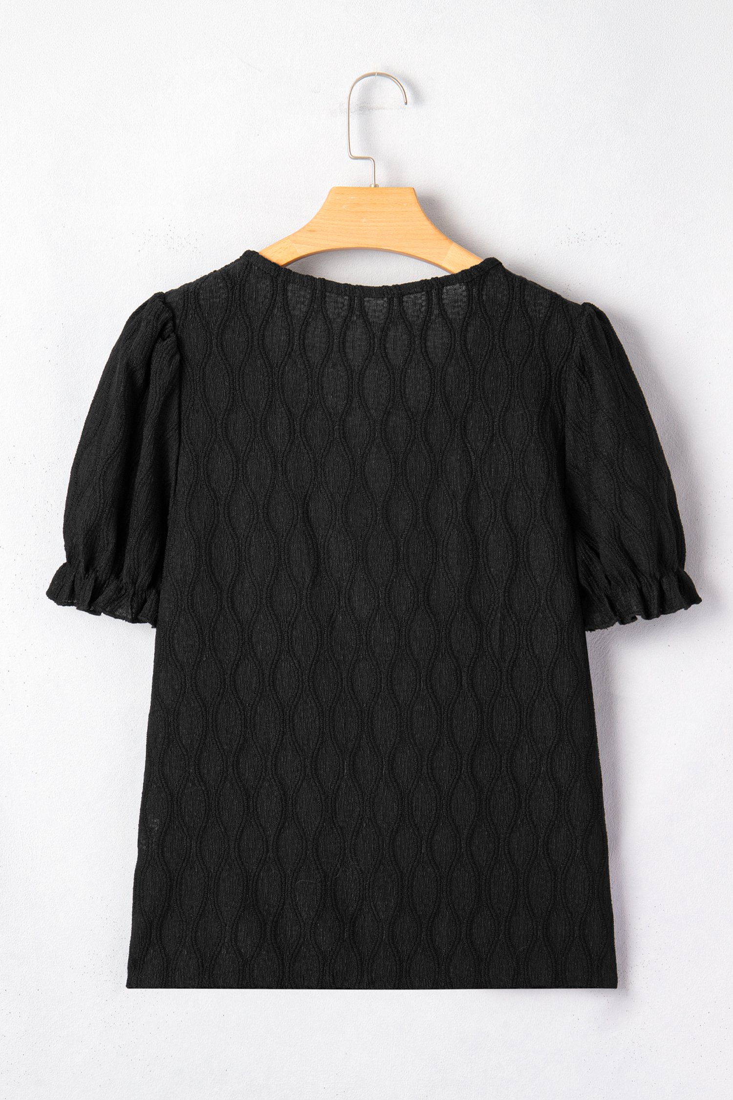 Black Solid Color Textured Notched Neck Puff Sleeve Blouse