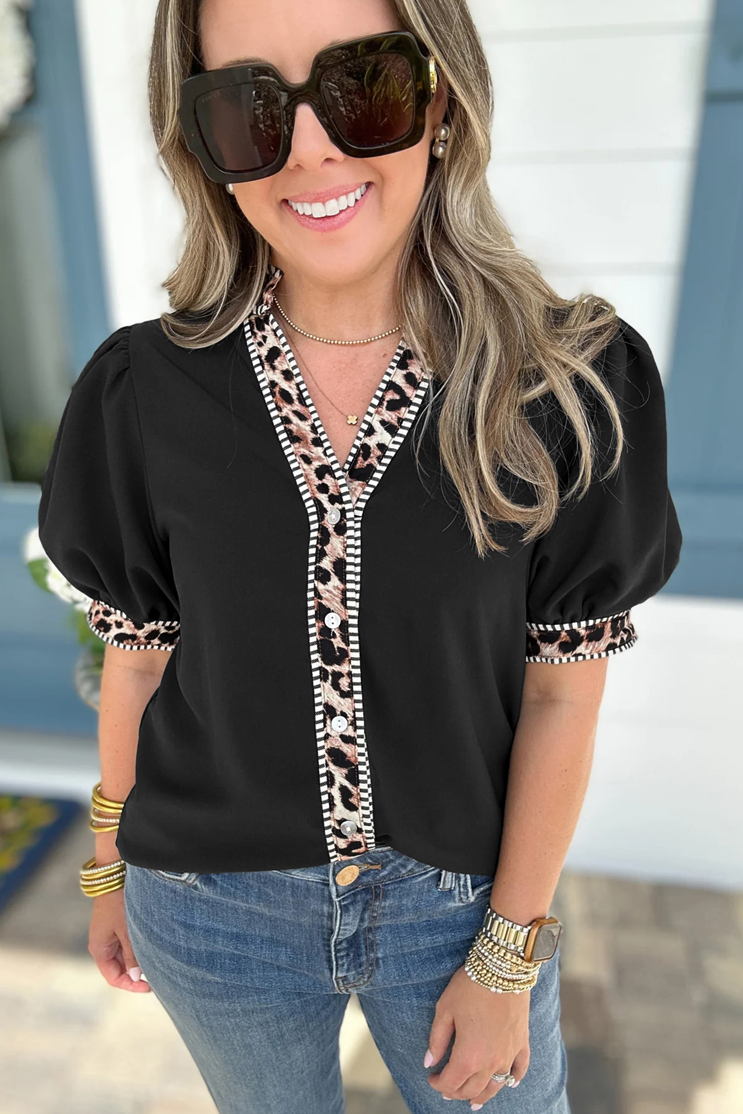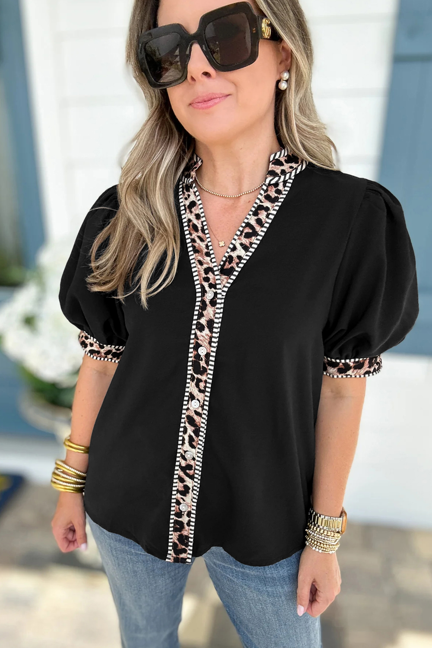 Contrast striped leopard trim keeps the button down blouse fresh and trendy.