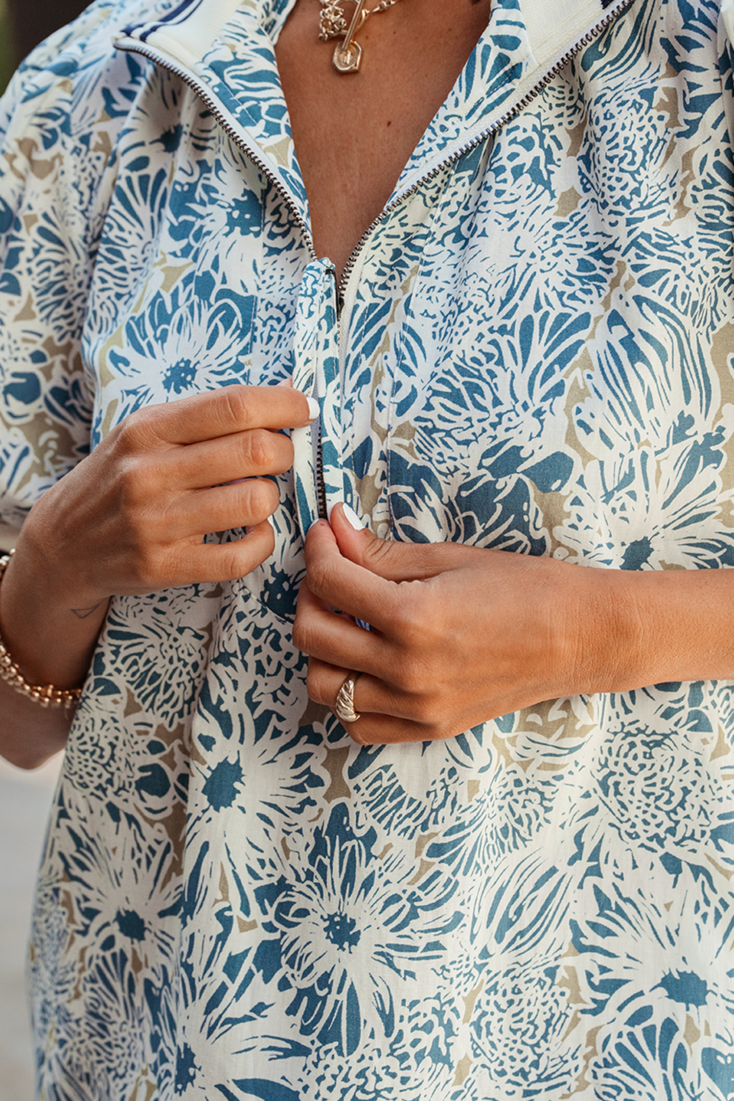 Collared neckline adds structured detail to a feminine floral silhouette.