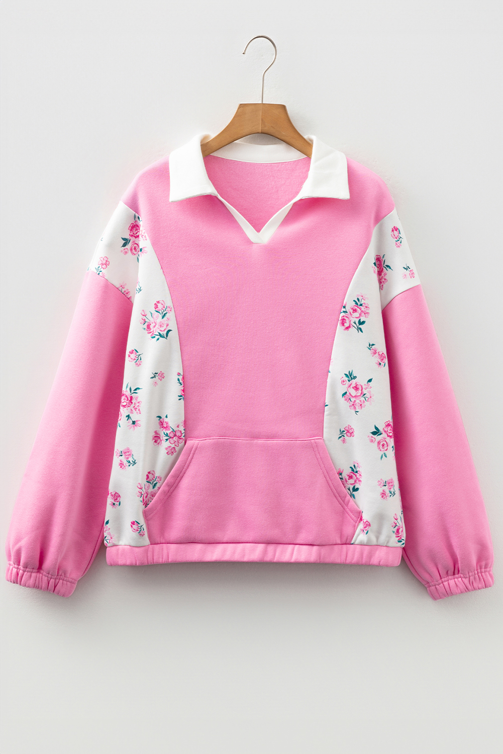 • Pink pullover top with floral patchwork creates a trendy contrast look.