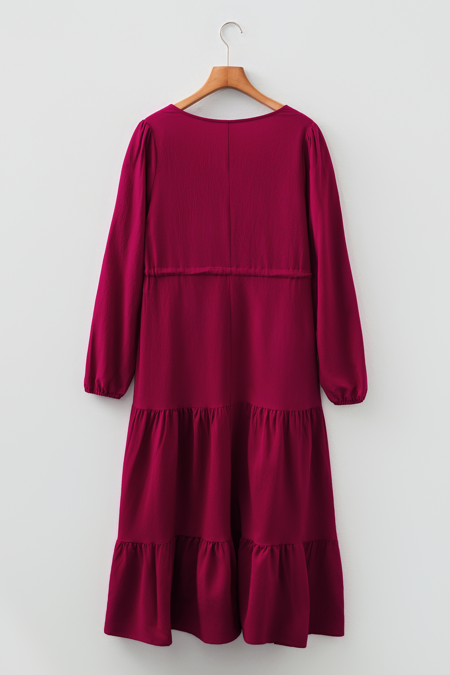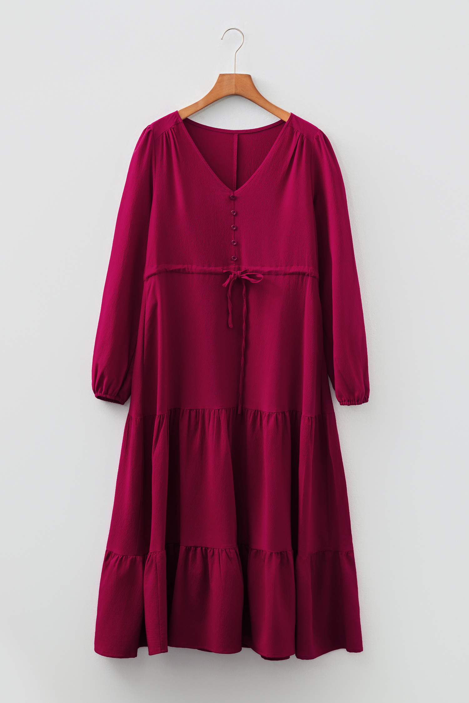 Be the first to review “Burgundy Solid Long Sleeve Button V Neck Tiered Maxi Dress”