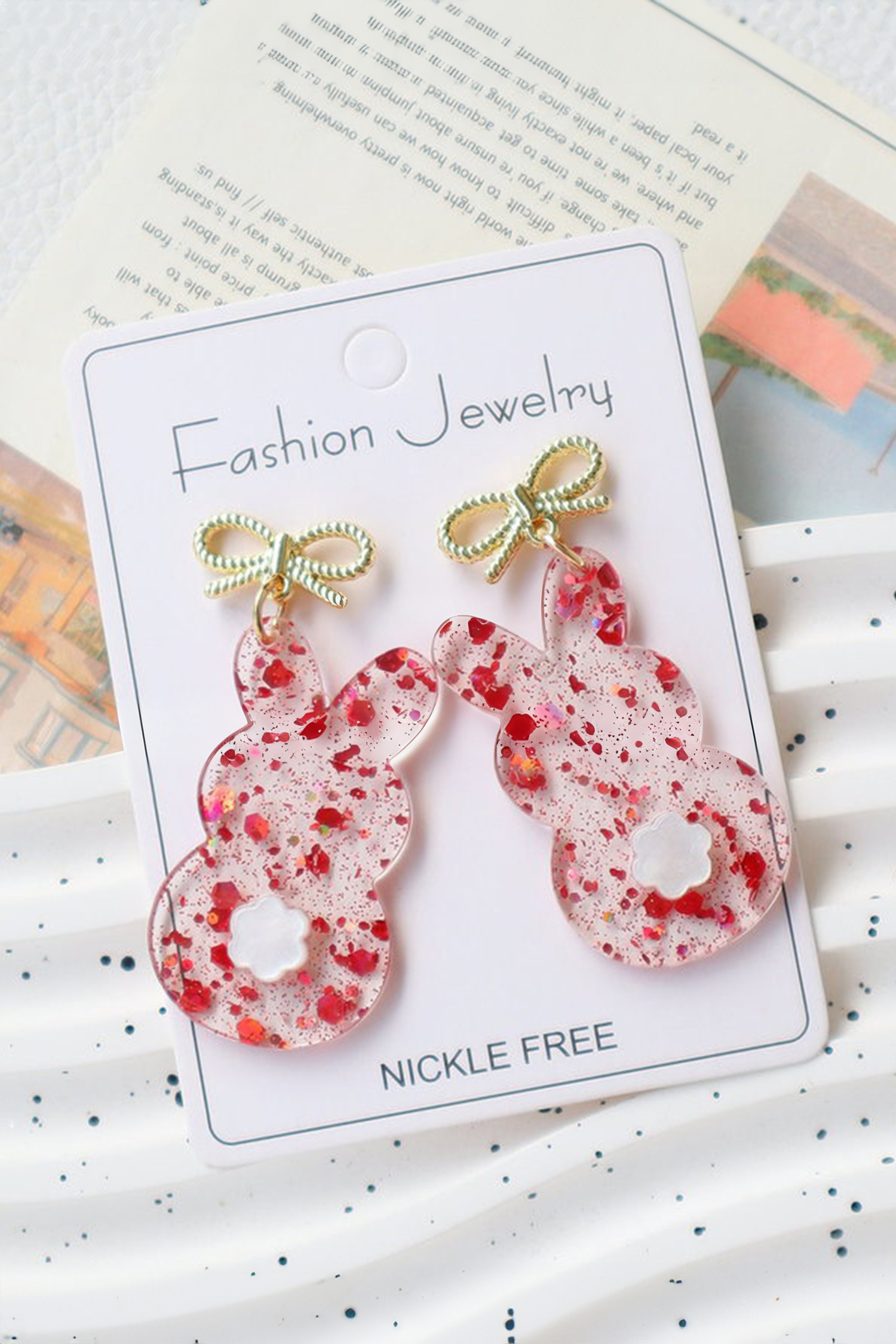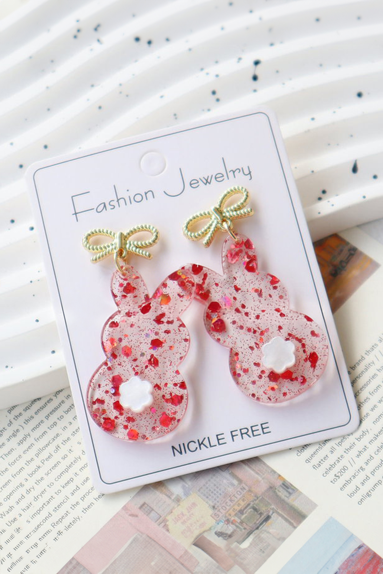 Fiery Red Clear Easter Bunny Bowknot Studded Earrings