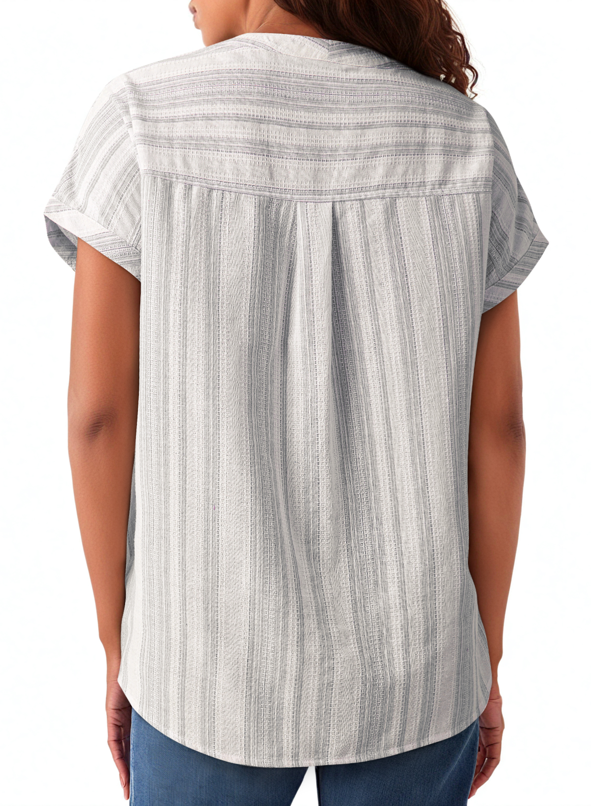• Striped gauze blouse delivers a light, airy everyday look.