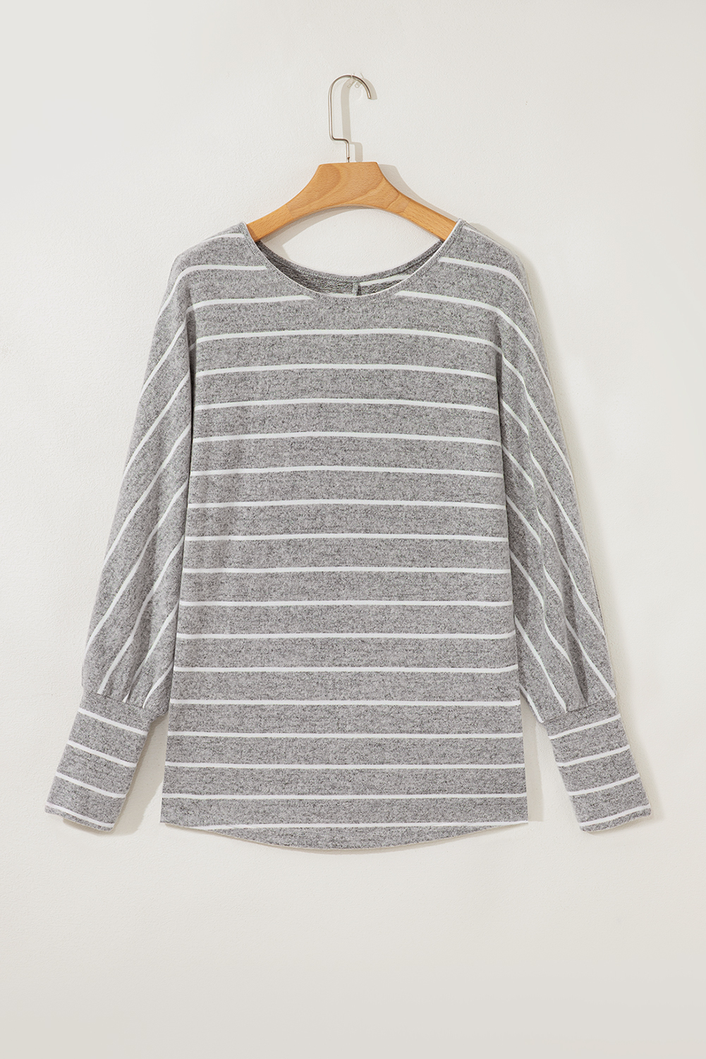 It has a round neck, long dolman sleeves, and a relaxed fit.