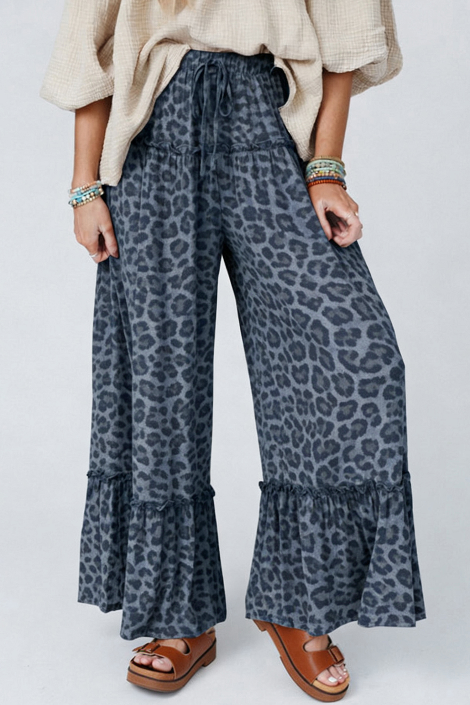Gray Wild Leopard Print Frilled Detail Drawstring Wide Leg Pants