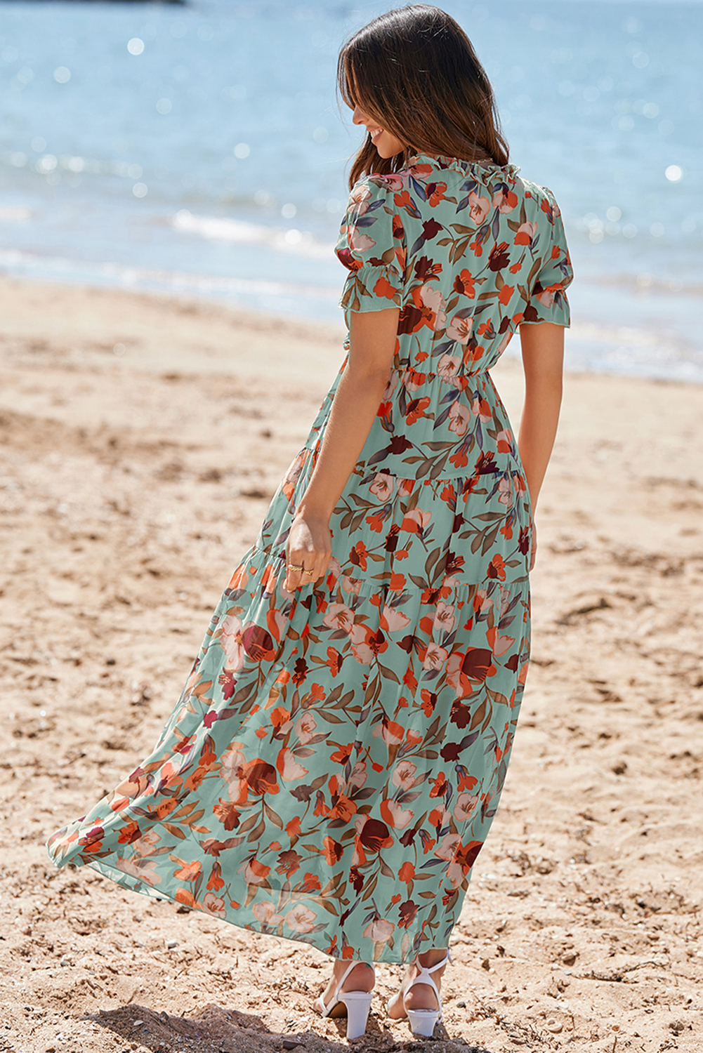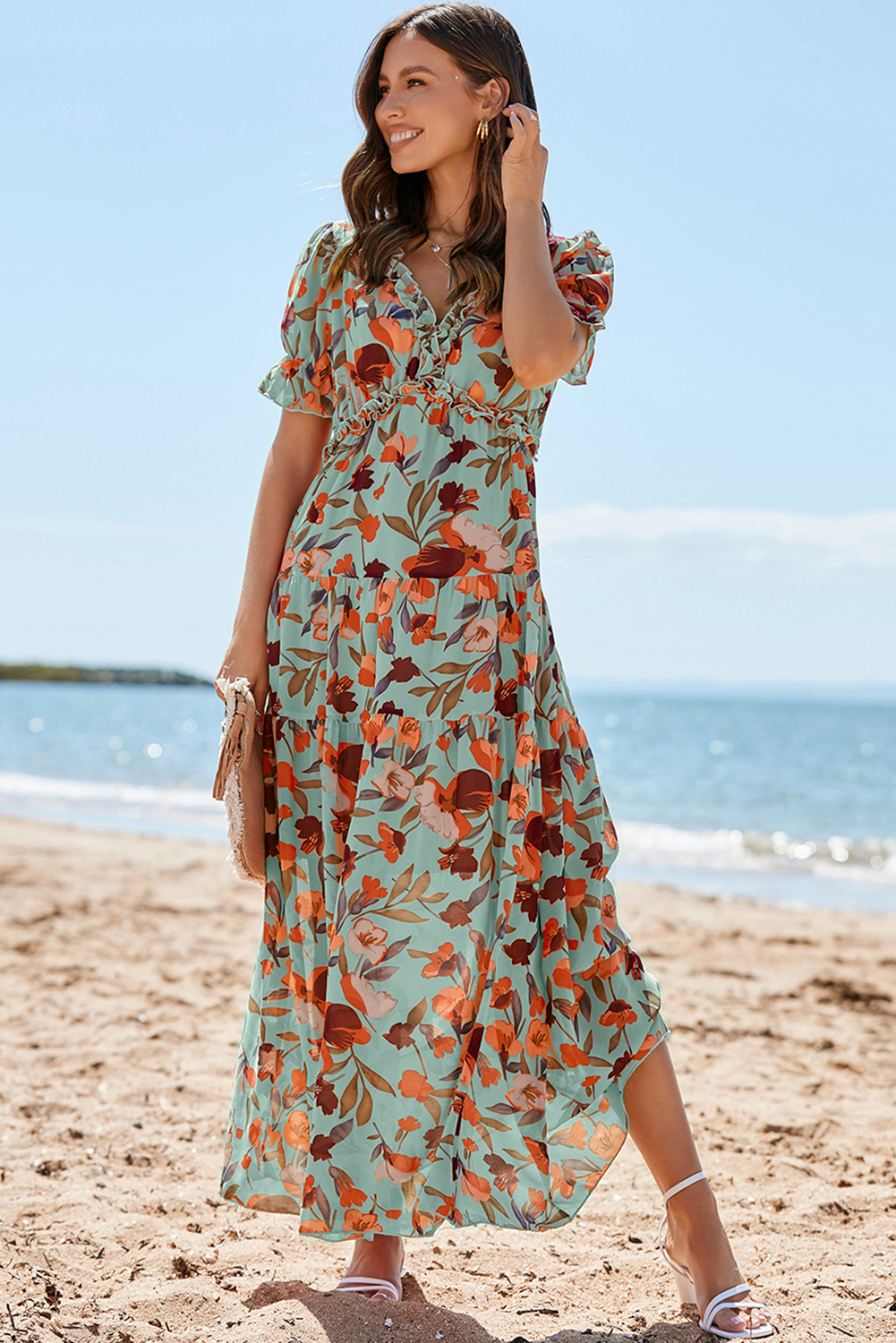 Green Fiery Floral Print Frilled V Neck Short Sleeve Maxi Dress