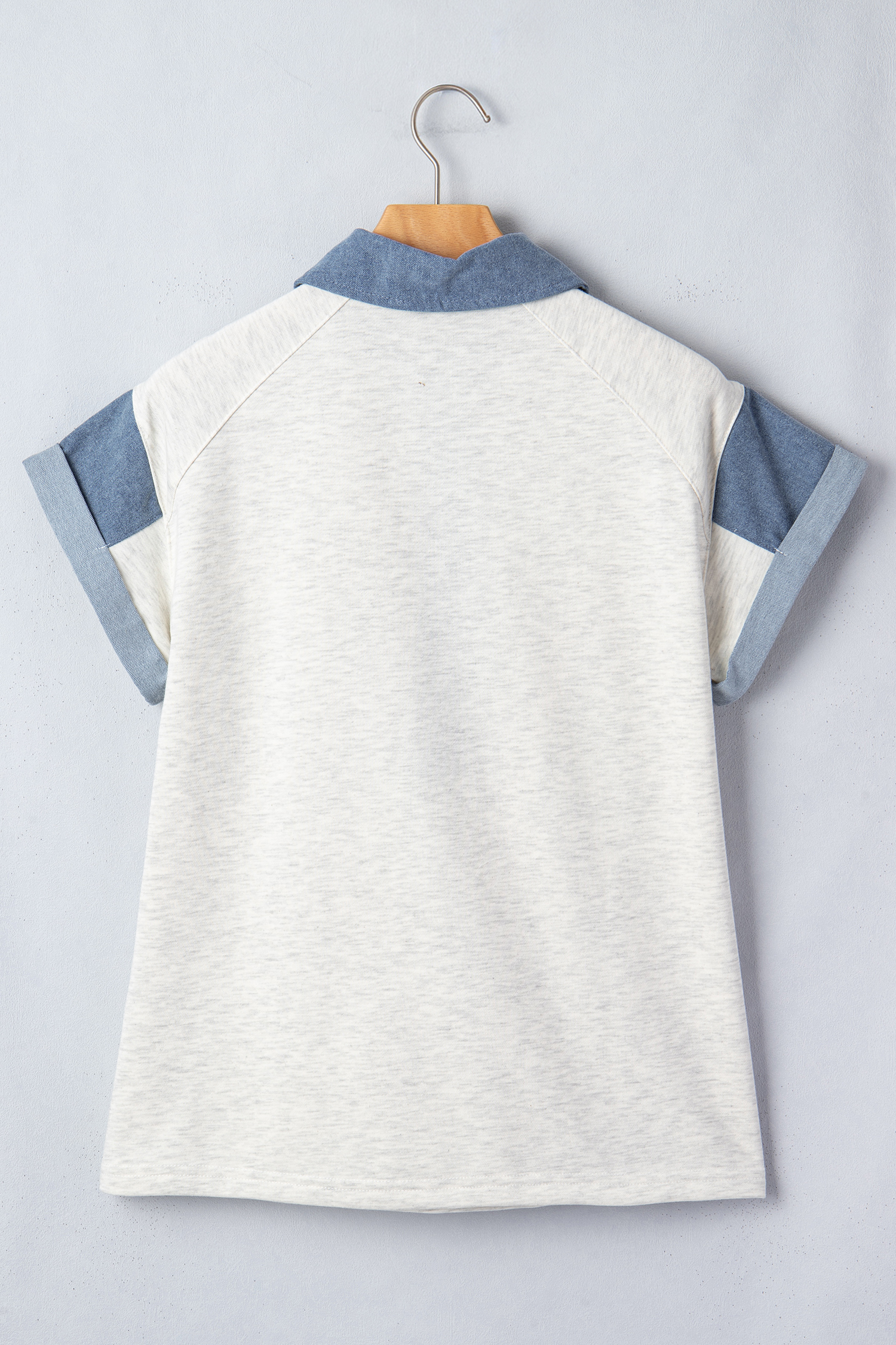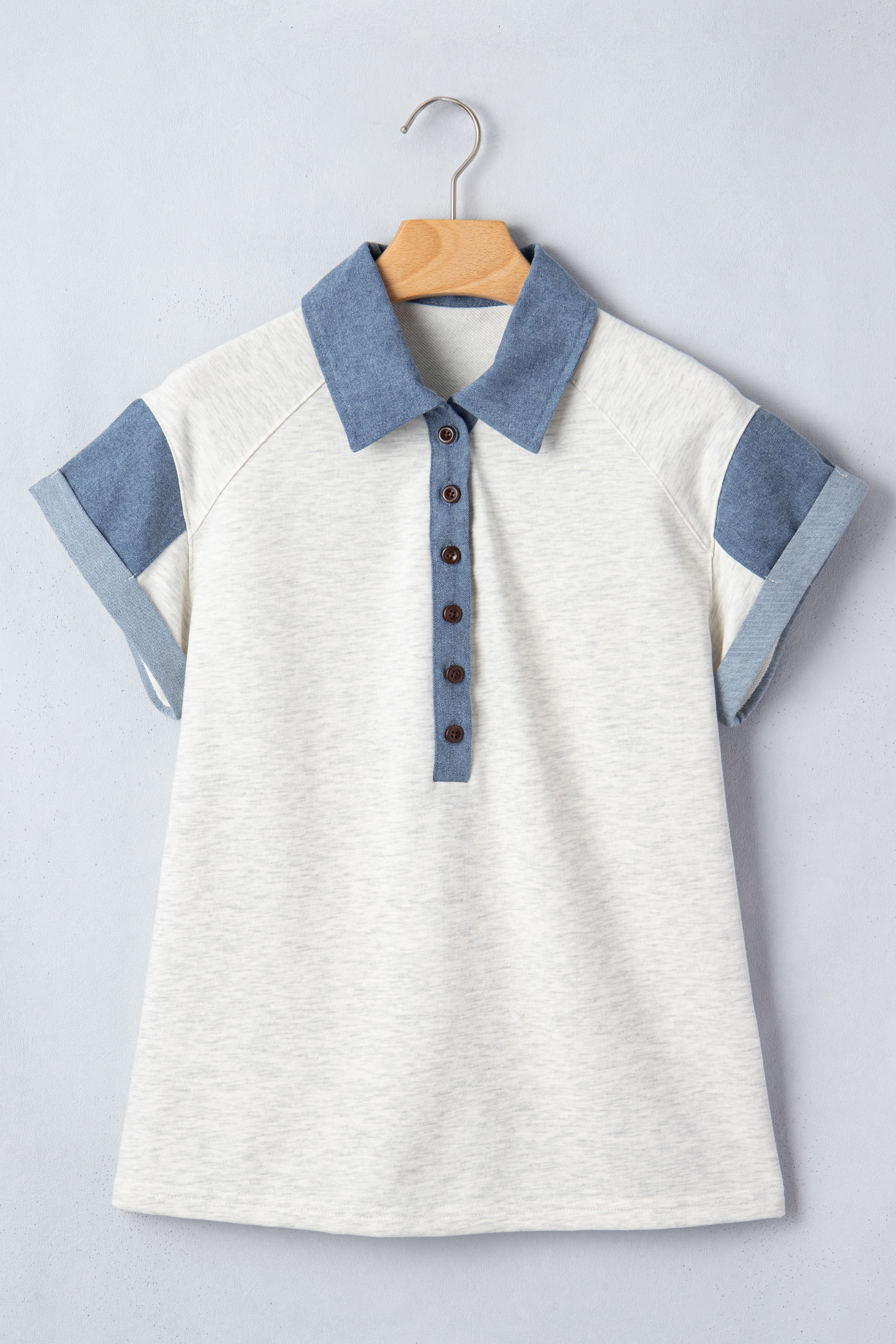 - This is a chic denim patchwork polo t shirt for women.