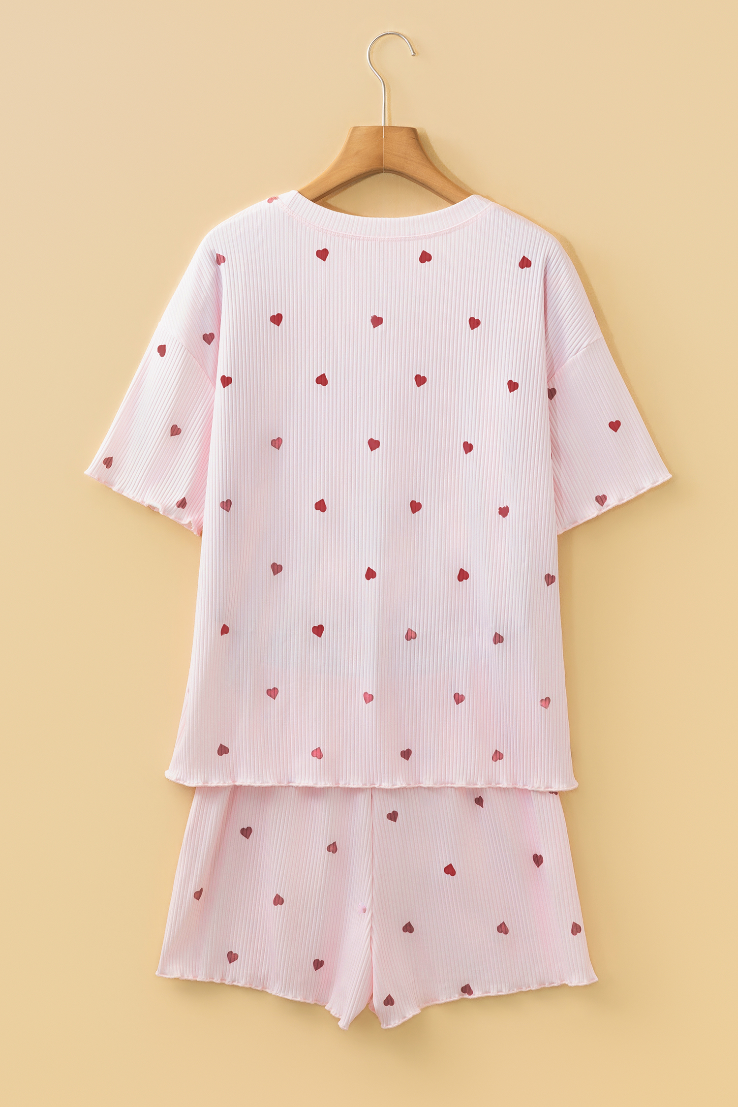 It features a charming heart print adorning both the tee and shorts.