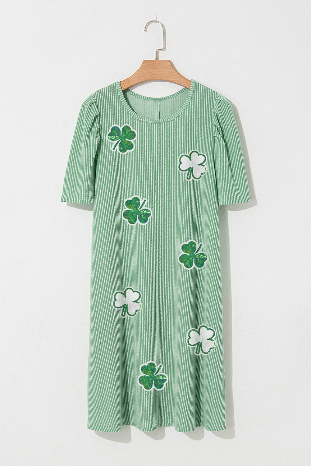 Mint Green Sequin Clover Graphic Puff Sleeve Corded T Shirt Dress
