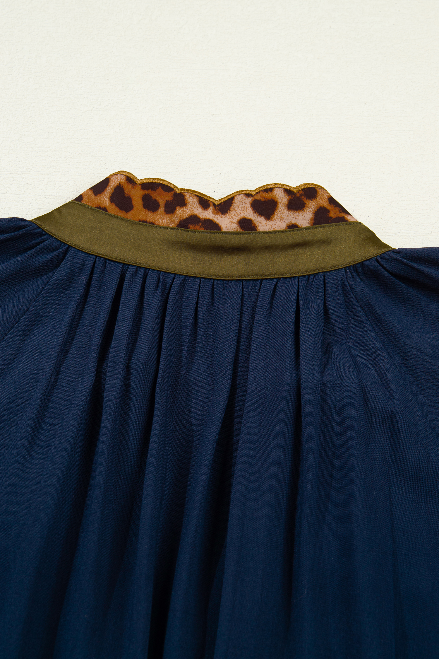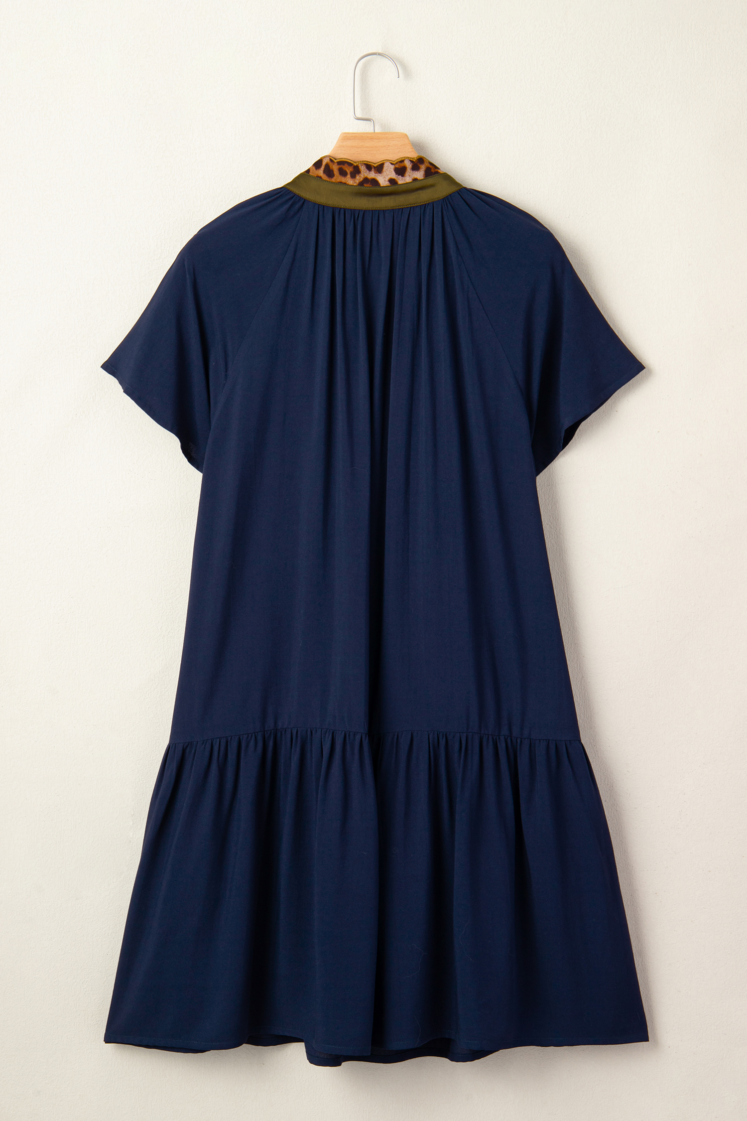 The shift dress has a contrast patchwork and button details.