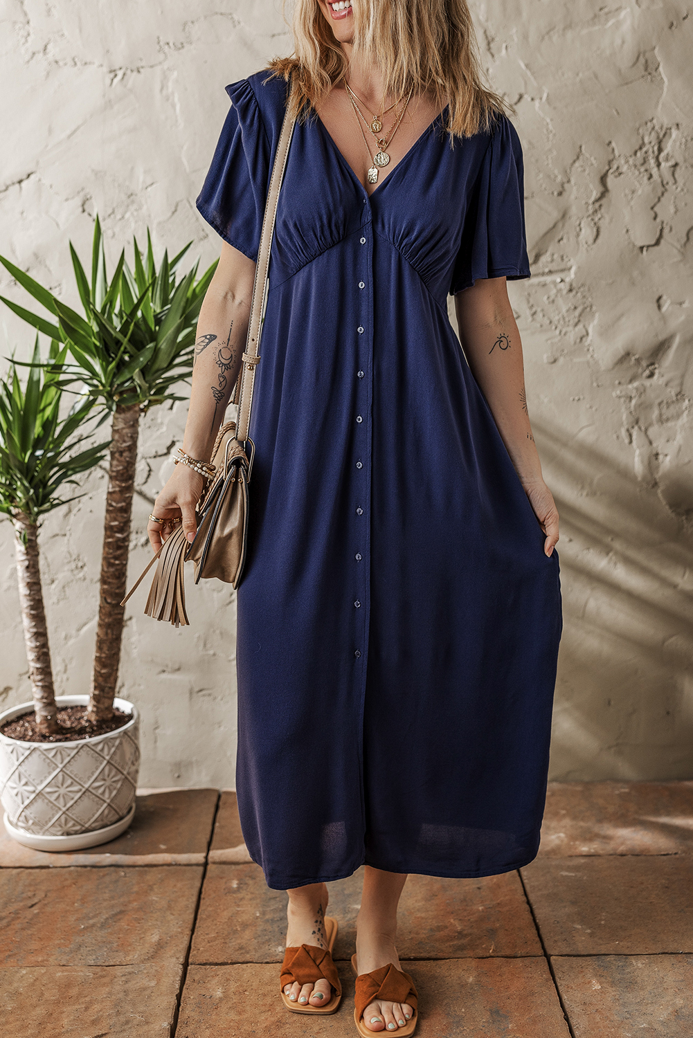 Be the first to review “Navy Blue V Neck Buttoned Front Shirred Back Short Sleeve Midi Dress”