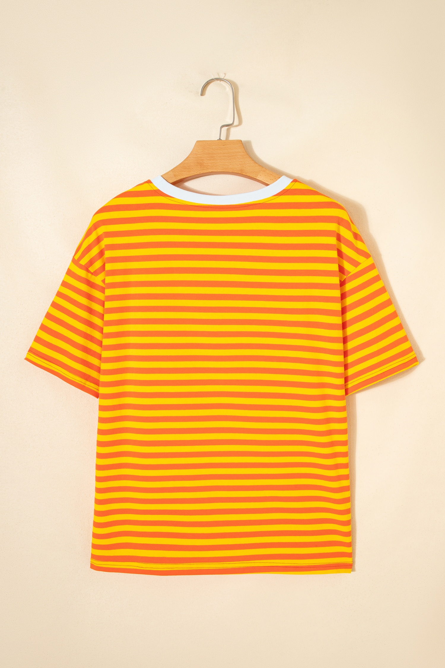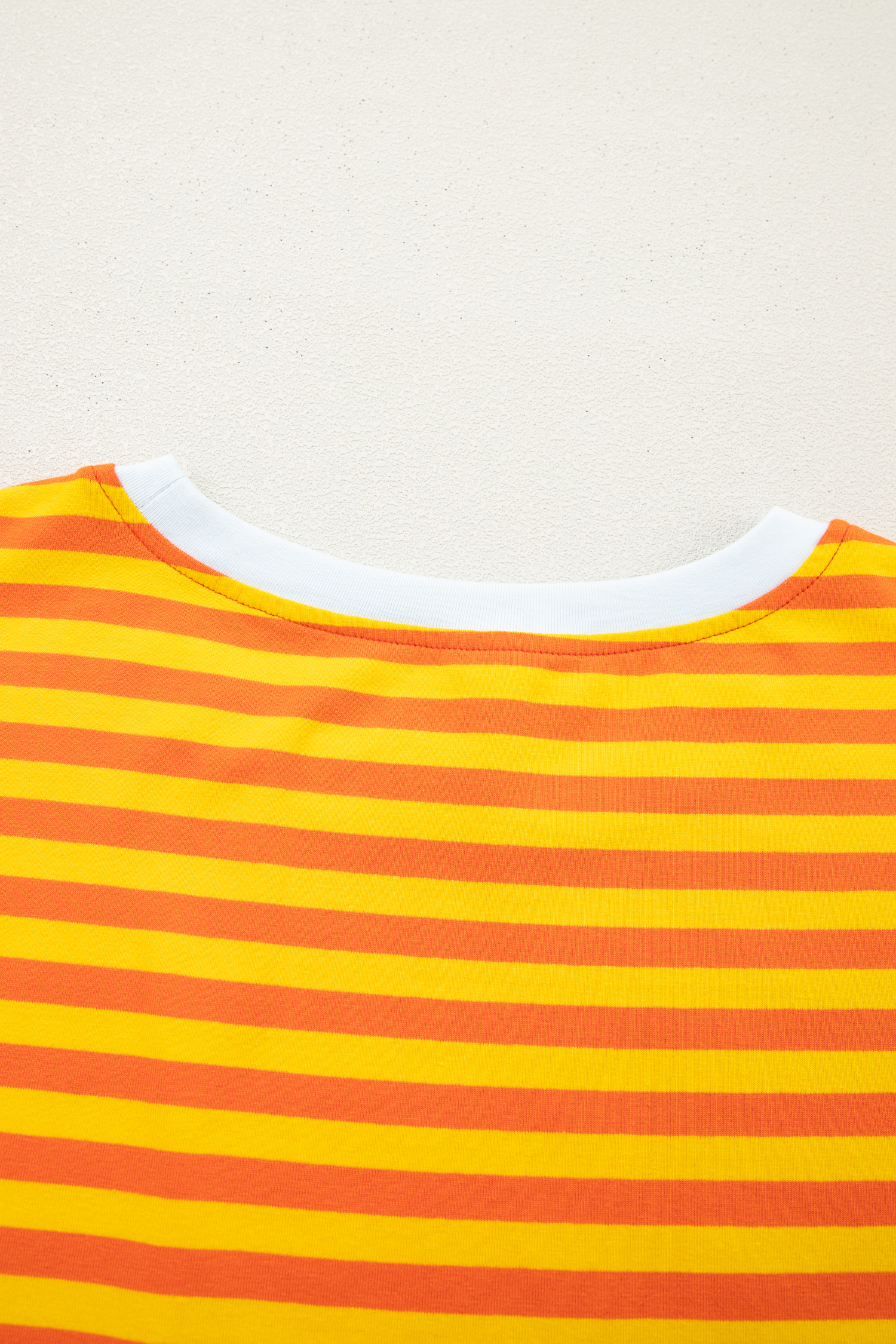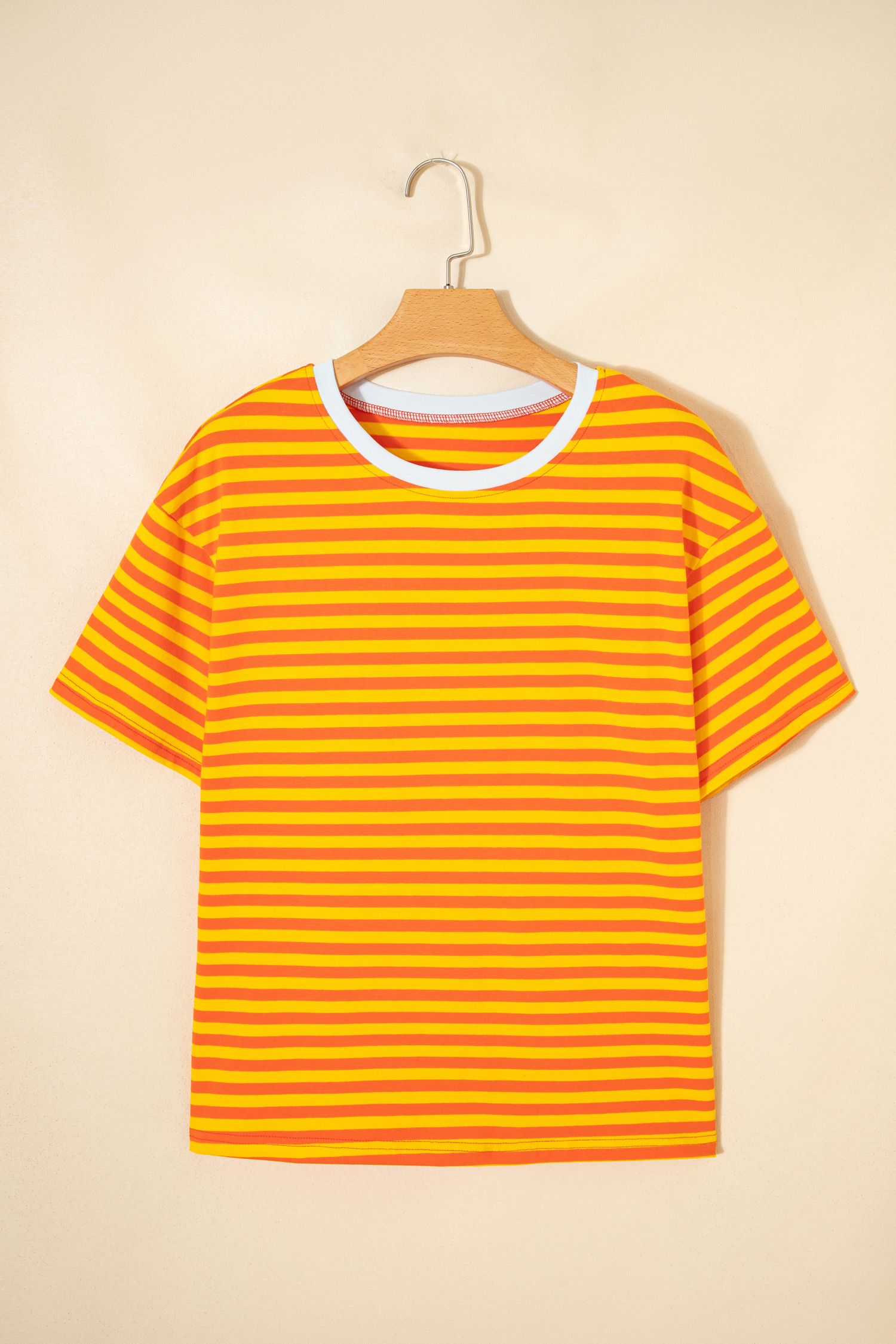 Orange Stripe Contrast Crew Neck Drop Shoulder Loose Tee