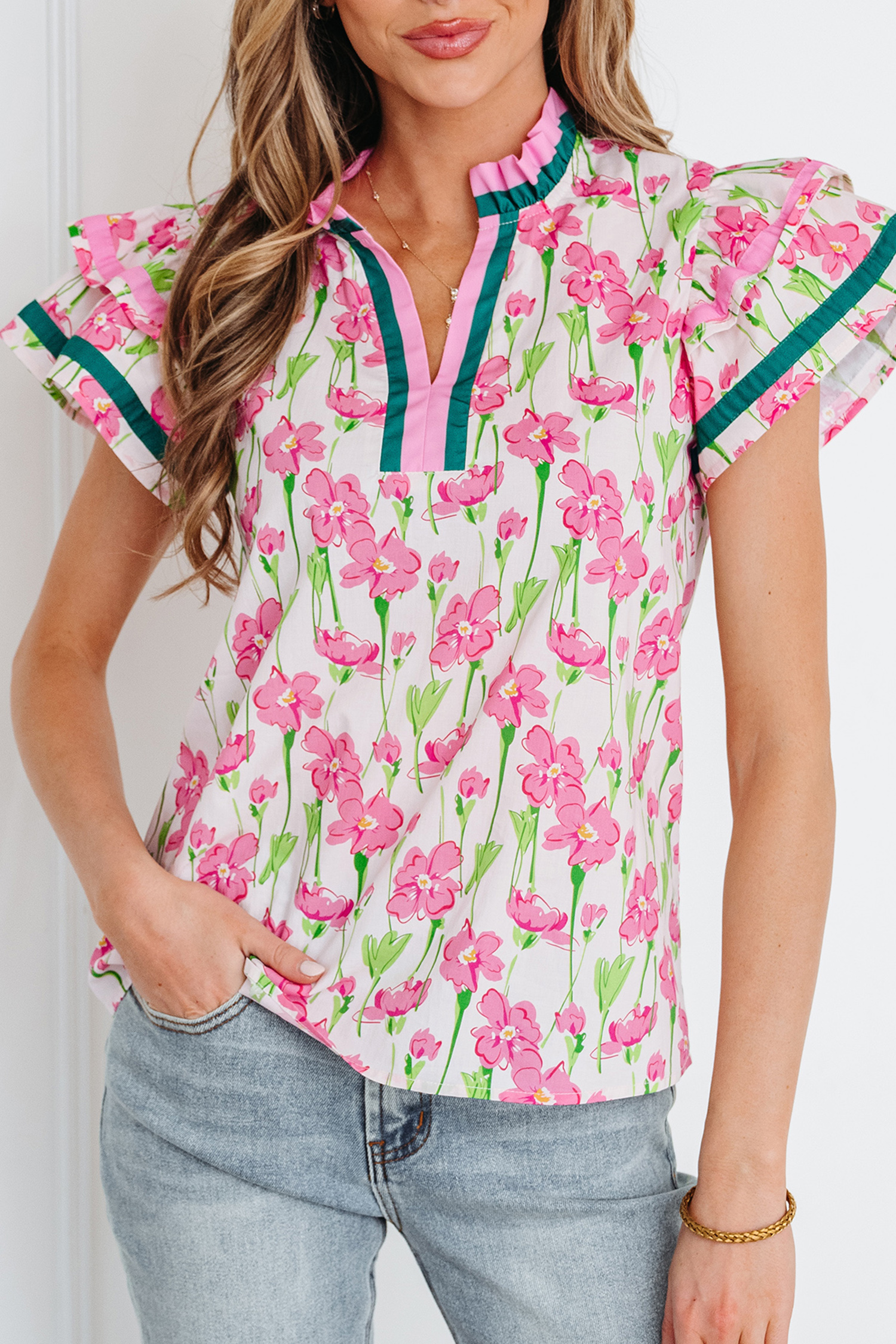 - Elegant floral print blouse with contrast trim adds a refined feminine vibe.