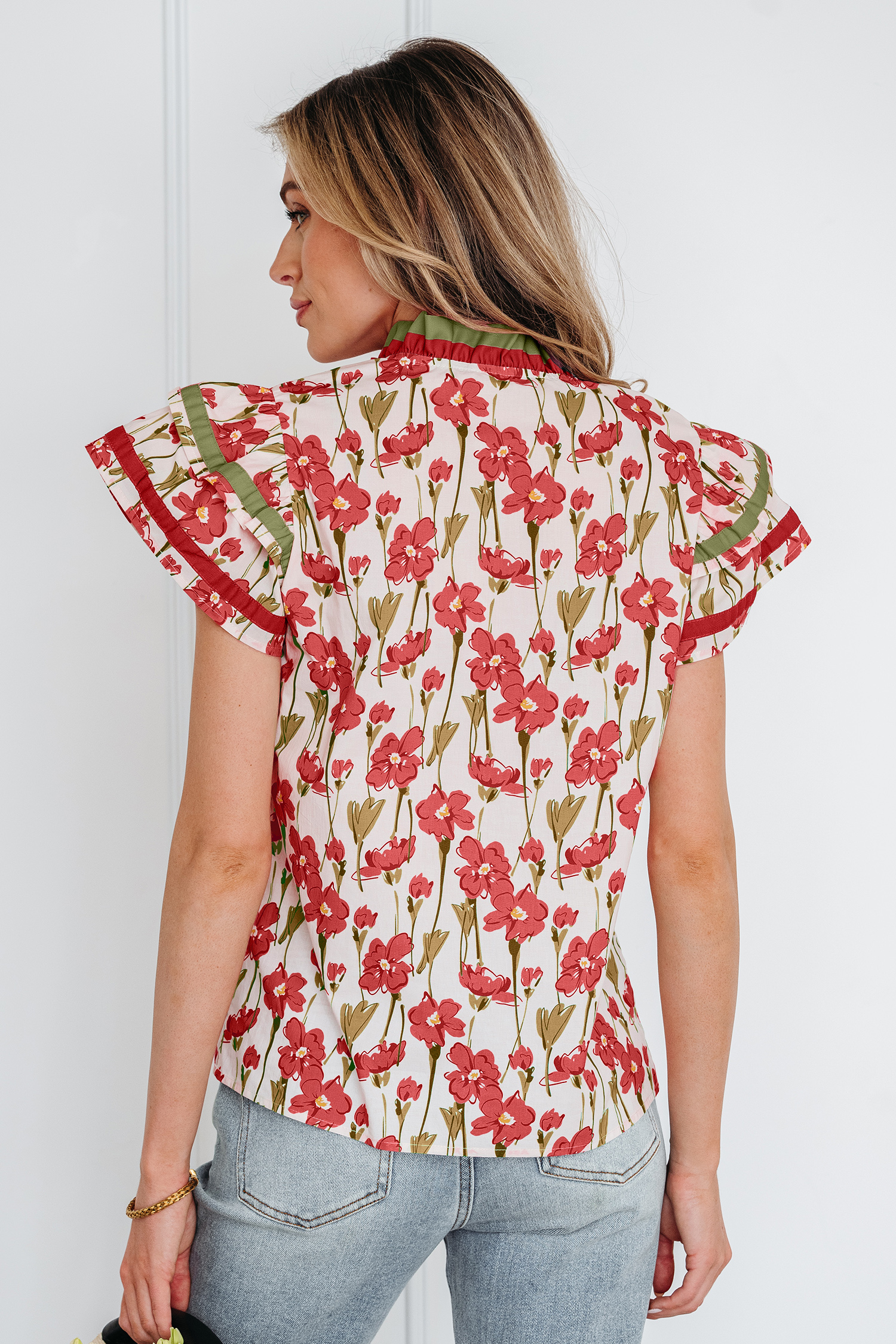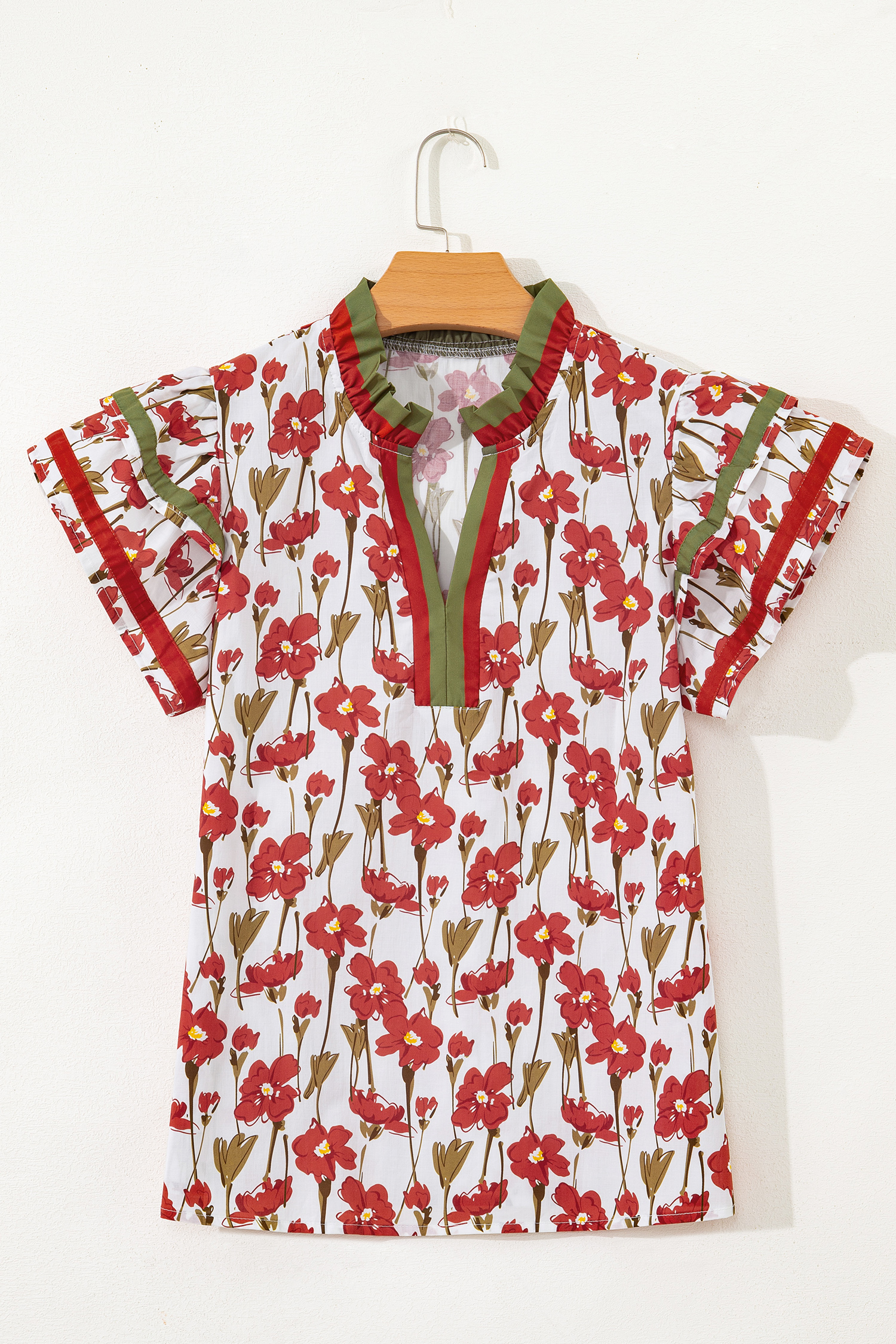 - Elegant floral print blouse with contrast trim adds a refined feminine vibe.