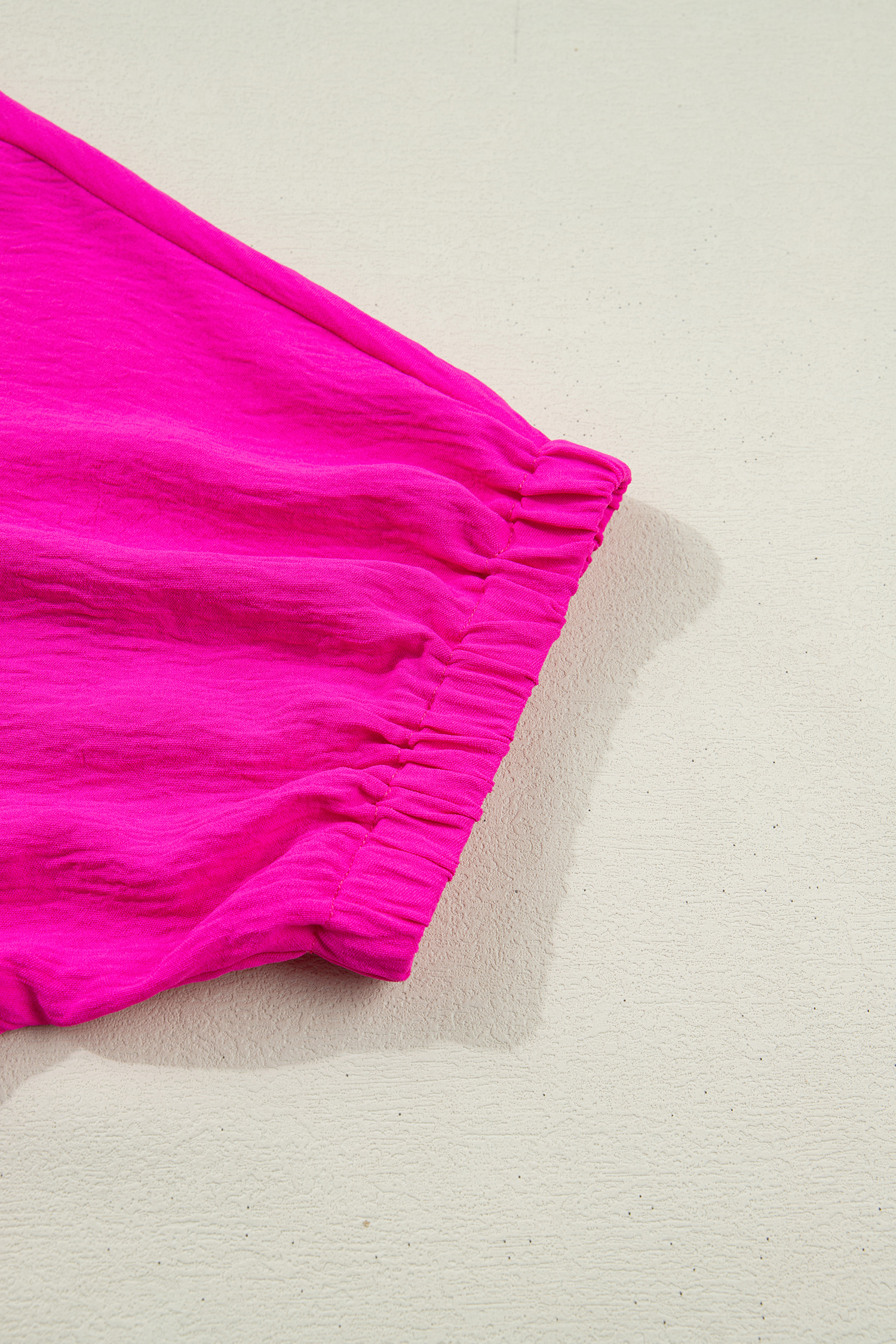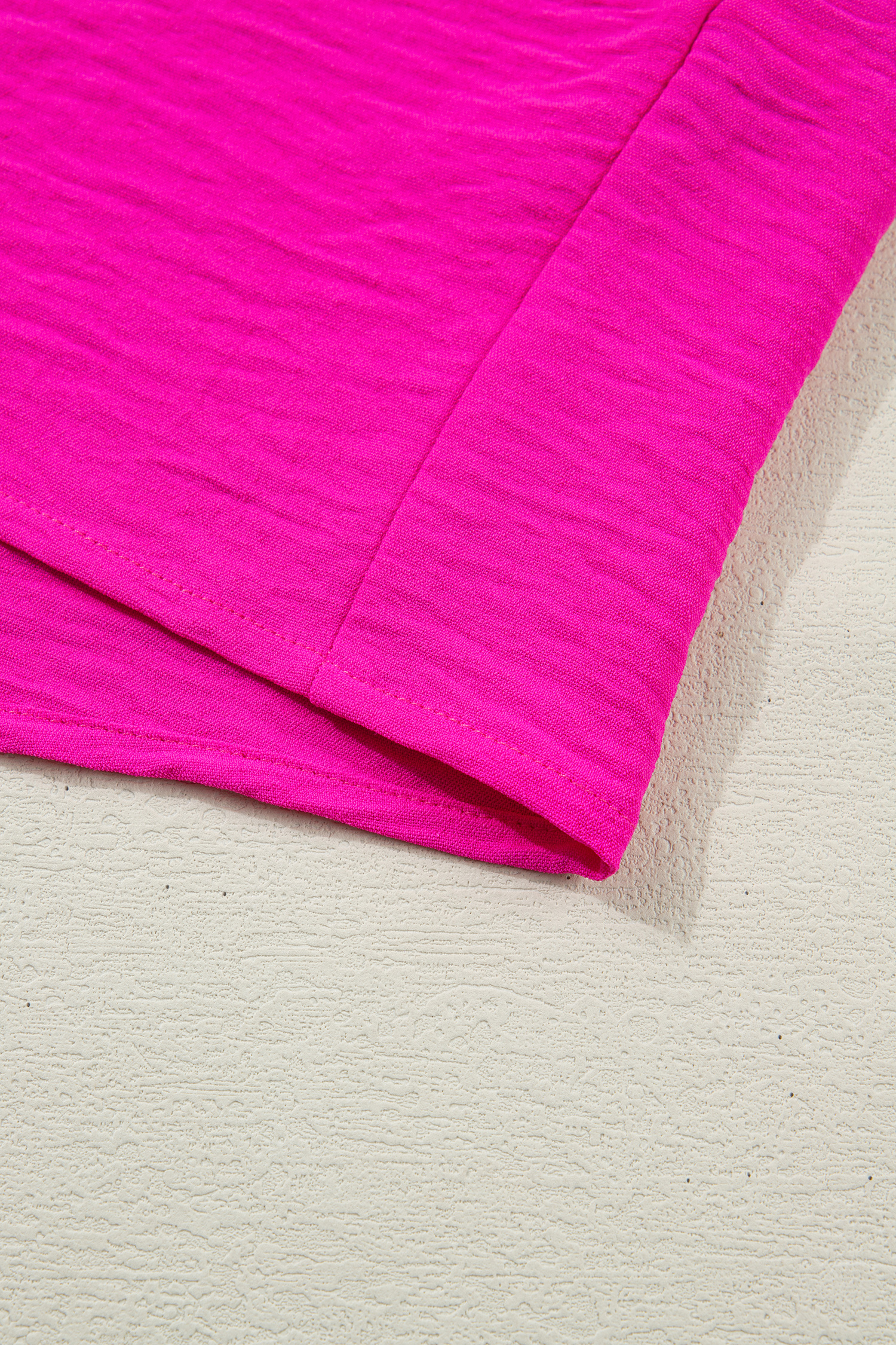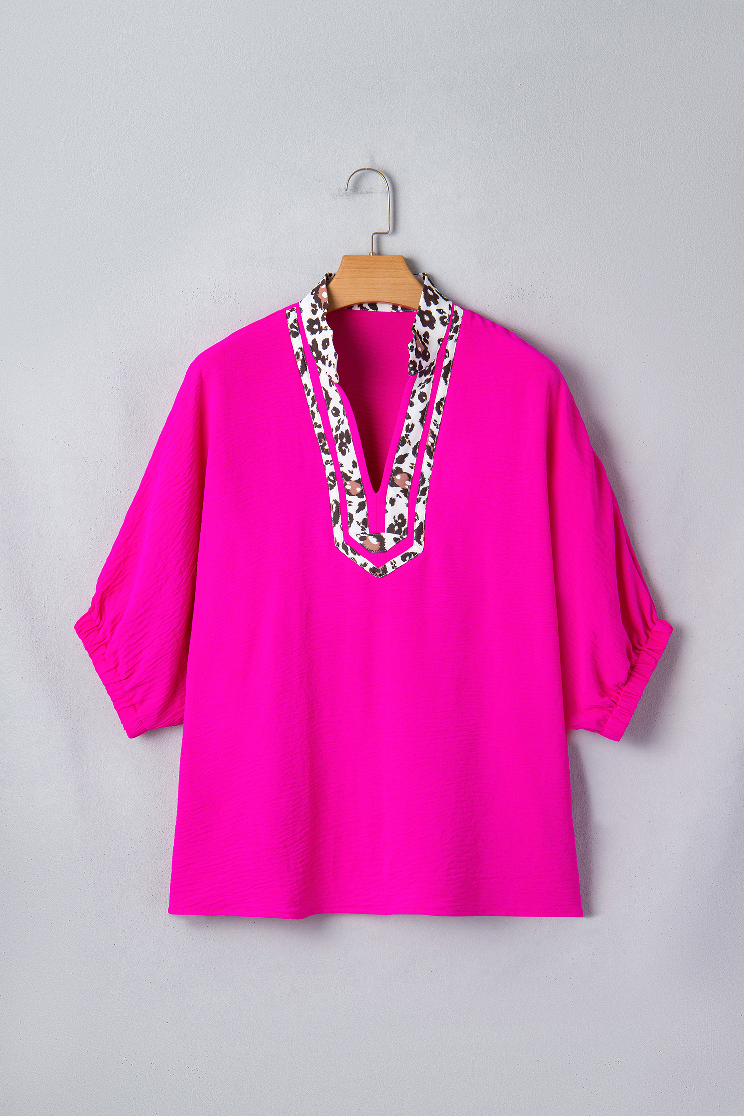 Rose Red Dolman Half Sleeve Leopard Patchwork Trim V Neck Blouse