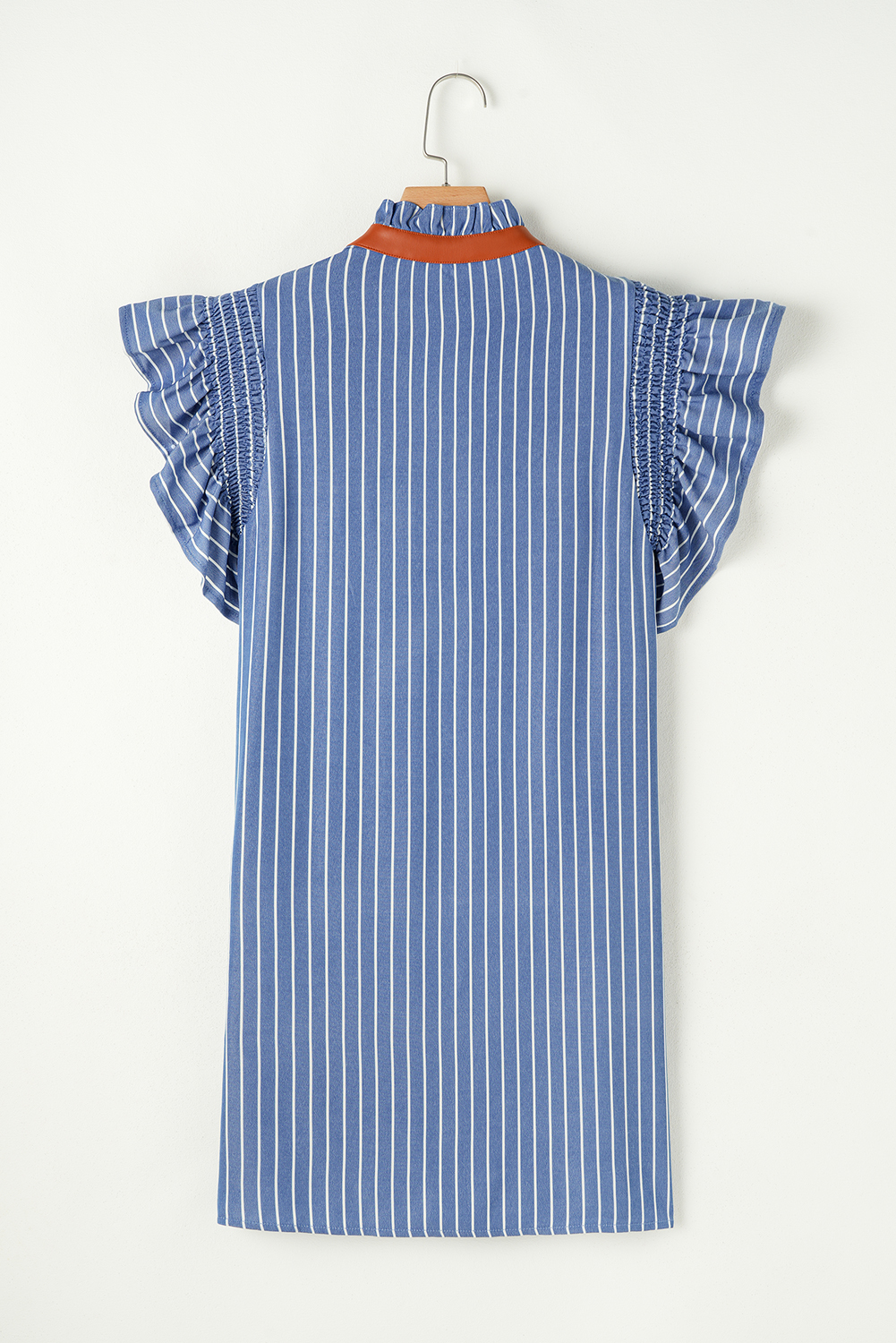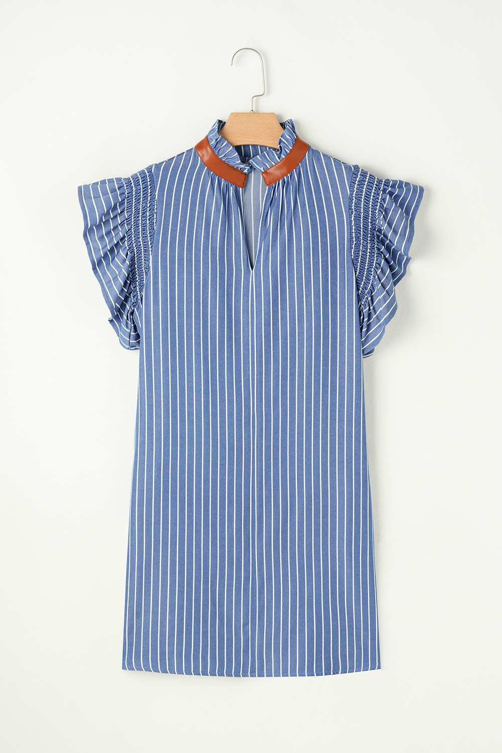 Be the first to review “Sky Blue Stripe Frilly Split Neck Shirred Ruffle Sleeve Short Shift Dress”