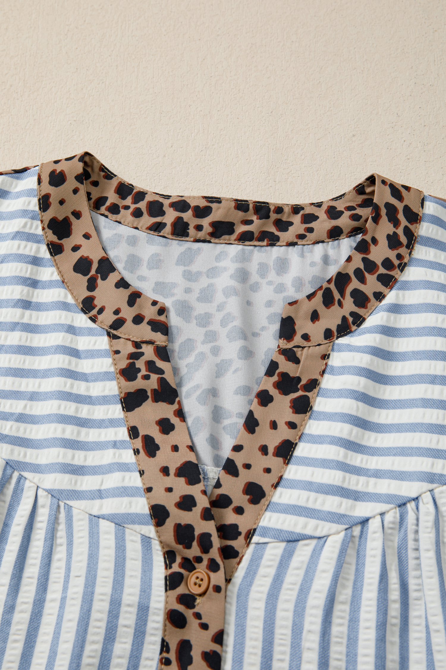 Be the first to review “Sky Blue Stripe Leopard Trim V Neck Button Down Half Sleeve Shirt”