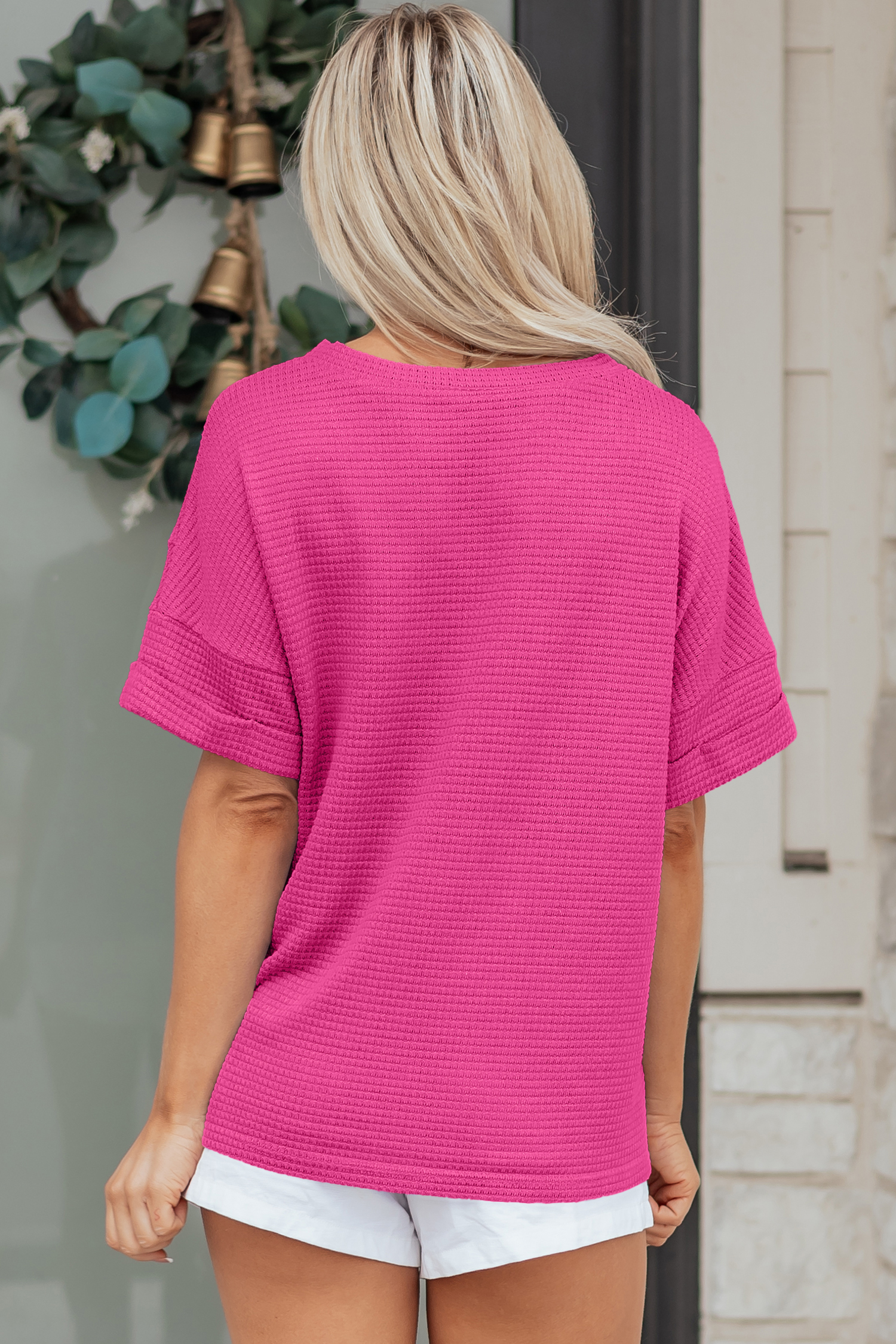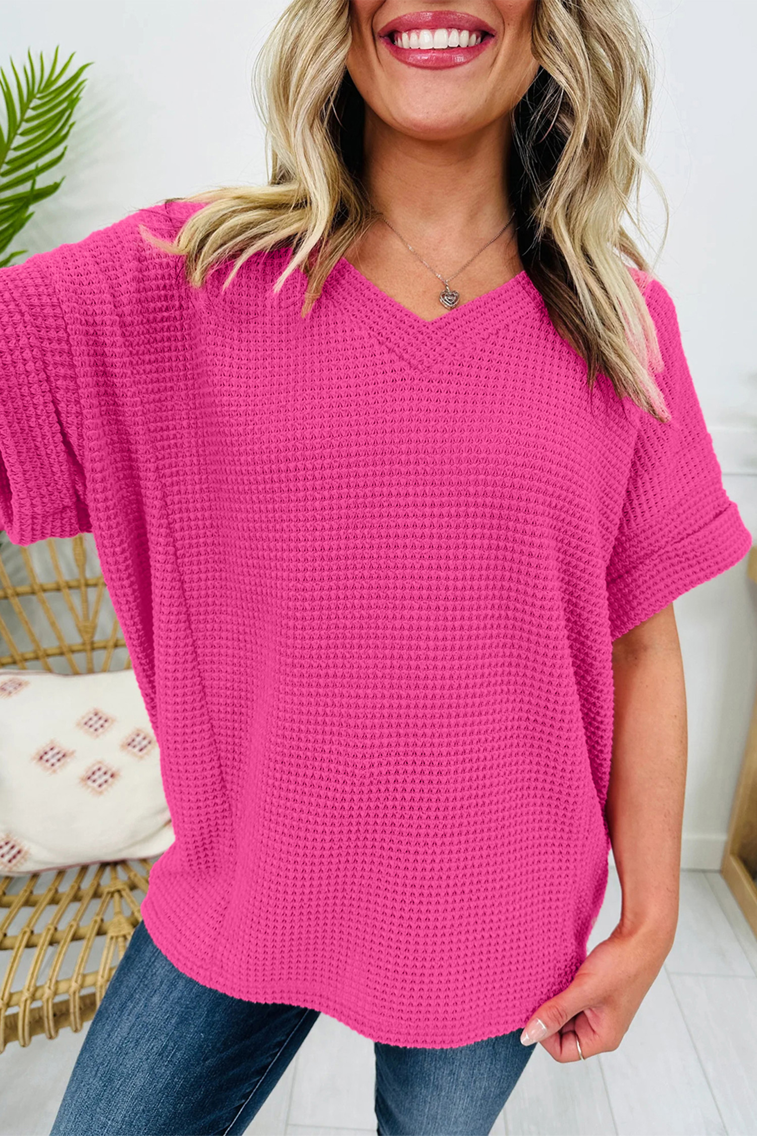 Strawberry Pink Waffle V Neck Short Sleeve Knit Top