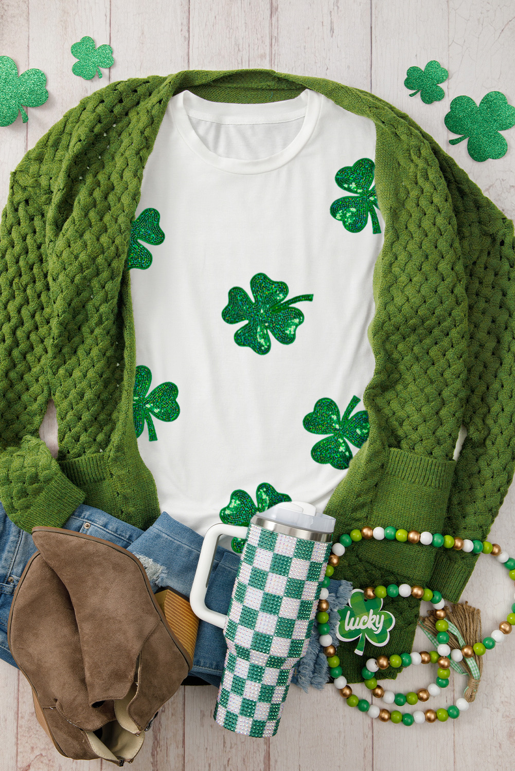 - Sequin clover patches add a sparkling touch to the festive tee.